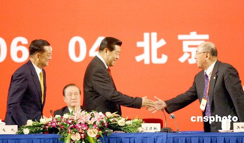 四月十四日,国共两岸经贸论坛在北京开幕,全国政协主席贾庆林与中国国民党副主席吴伯雄在开幕式结束后握手致贺。作者:盛佳鹏