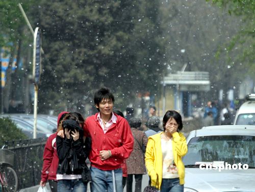 4月14日,北京甘家口大街上飞絮满天。刚刚送走了讨厌的沙尘,北京气温回升,杨柳吐绿,但雌杨树又开始飘絮,北京市平原地区的树木超过1.2亿株,其中杨、柳树占70%左右,这是京城春季飞絮的“罪魁祸首”。作者:廖攀