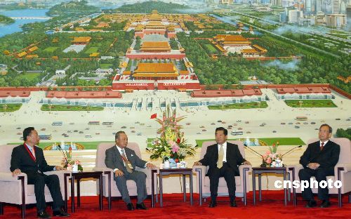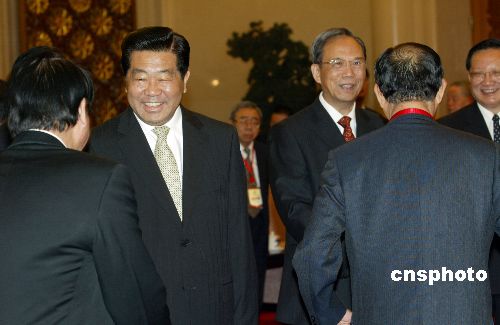 四月十四日,全国政协主席贾庆林在北京人民大会堂会见来京出席两岸经贸论坛的台湾企业家。作者:史利