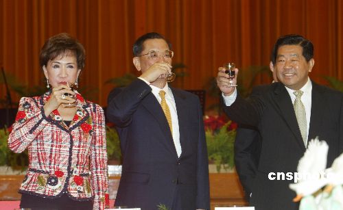 四月十四日,全国政协主席贾庆林在北京人民大会堂宴请来京出席两岸经贸论坛的连战一行。作者:史利