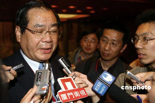 四月十四日,两岸经贸论坛在北京开幕,中国国民党政策会执行长曾永权参加了论坛讨论,在休息期间被记者追访两岸直航等问题。作者:盛佳鹏