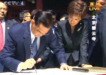 中国国民党荣誉主席连战在香山碧云寺孙中山纪念堂前题字“青山有幸伴中山,同志无由忘高志”。