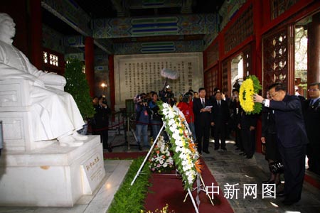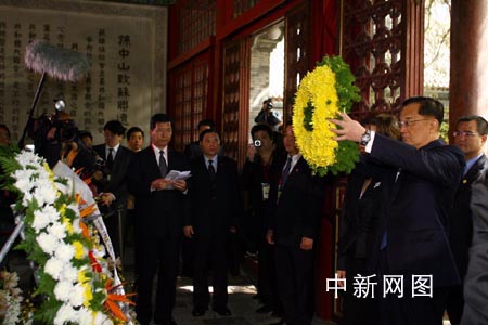 中国国民党荣誉主席连战今日(15日)上午10时左右,率团前往香山碧云寺拜谒孙中山先生衣冠冢,在中山纪念堂向中山先生像致敬献花。中新社记者:盛佳鹏