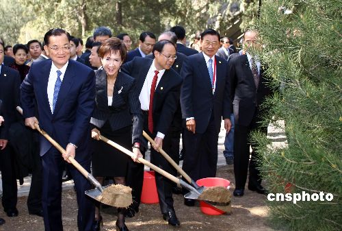 四月十五日,中国国民党荣誉主席连战在北京香山碧云寺向孙中山像敬献花环,并拜谒孙中山衣冠冢,在衣冠冢北侧空地栽下一棵白皮松。作者:盛佳鹏