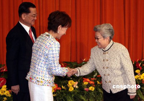 四月十六日,中共中央政治局委员吴仪,在北京人民大会堂与中国国民党荣誉主席连战夫妇握手致意。作者:廖文静