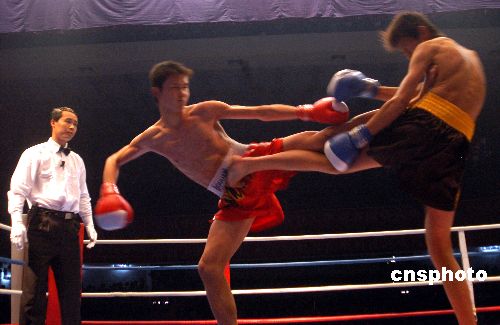 4月15日,武术散打选手正在比赛。当日“2006中国·亳州汤都论剑武术散打王争霸赛”第一赛季的比赛在安徽省亳州市拉开帷幕。由安徽省亳州市主办的“2006中国·亳州汤都论剑武术散打王争霸赛”将分7个赛季进行,来自上海、海南、江苏、浙江、江西、河南、山东、安徽等省市的48个代表队的256名运动员将将陆续参加8个级别的武术散打比赛。作者:张延林