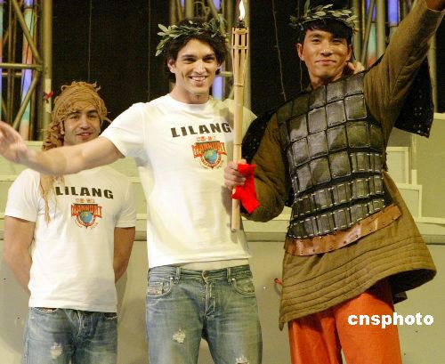 图为希腊选手在晚会上向中国参赛选手“传递火炬”,祝愿2008年中国奥运会举办成功。作者:钱兴强