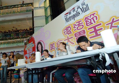 4月17日,香港复活节假期的最后一天,都会商场举办的“香港美食大胃王”进行得如火如荼,参赛者在经过多天的4次初赛后,争夺奖金5000元的冠军宝座。台上参赛者一显大胃口本色,台下笑声不断。作者:洪少葵