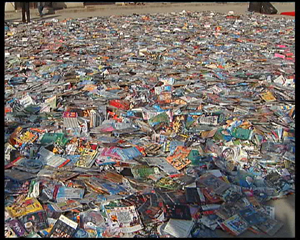 而这只是去年来北京众多公开销毁行动中的一次,2005年,北京市各级行政执法单位全年共出动执法检查人员17.2万人次,检查音像单位9.35万家次,书报刊经营单位9.31万家次,共取缔违法图书音像店、书摊2219家、非法经营的游商1836人次,共收缴非法出版物264.86万余册,收缴盗版音像制品261.5万张。