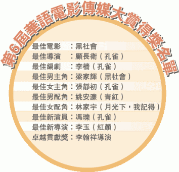 中新网4月18日电 "有中国奥斯卡"之称的《第6届华语电影传媒大赏》今年由内地移师香港举行,昨日在黄埔的酒店进行颁奖礼。梁家辉凭电影《黑社会》今年第八度称帝,而中国电影《孔雀》则造就内地演员张静初获封影后,同时成为赛中的大赢家,夺得"最佳导演"、"最佳编剧"、"最佳新演员"。至于《黑社会》则夺"最佳电影"奖。