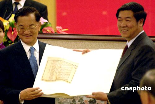 十八日下午六时许,厦门市宴请了来闽祭祖的连战一行。图为中共厦门市委书记何立峰向连战赠送连战祖父连横当年在厦门办的《鹭江报》、《福建日日新闻》的珍贵资料。作者:郑祚声