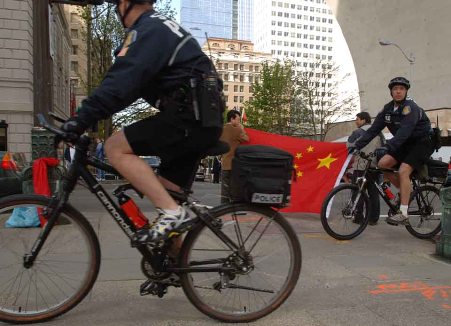 美国西雅图自行车骑警四月十八日清晨在奥林匹克酒店前巡逻,中国国家主席胡锦涛今天飞抵这里开始对美国的国事访问。