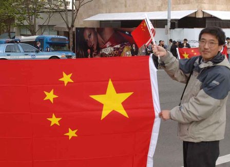 美国西雅图四月十八日清晨的奥林匹克酒店前,中国留学生挥舞中美国旗,热烈欢迎胡锦涛主席。