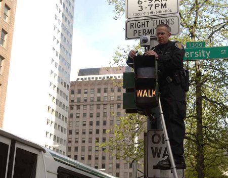 美国西雅图四月十八日清晨,警方在奥林匹克酒店前安装保安监视器,保障中国国家主席胡锦涛今天飞抵这里对美国的国事访问。作者:贾国荣