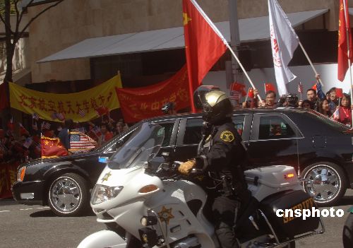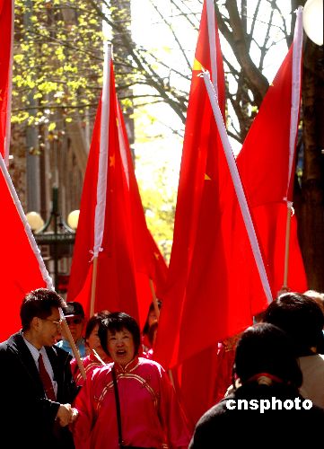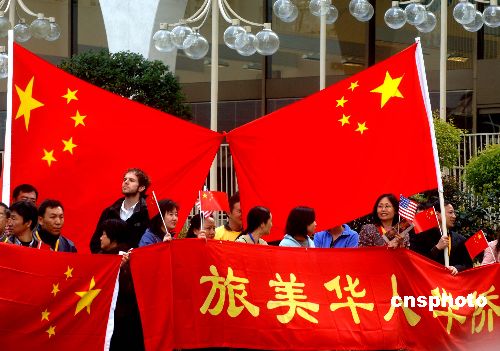 当地时间四月十八日,美国西雅图华人华侨和留学生在奥林匹克酒店外挥舞五星红旗,夹道欢迎中国国家主席胡锦涛抵达美国进行国事访问。作者:贾国荣