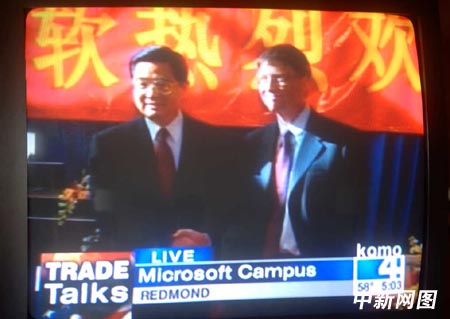 胡锦涛受到比尔.盖茨总裁的热烈欢迎。西雅图当地电视台在黄金时间现场直播。