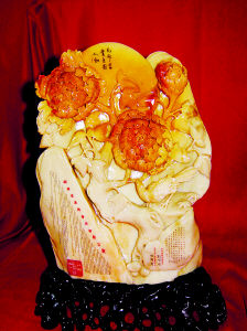 中新网4月19日电 中国著名微雕艺术大师许通海先生得知中国国民党荣誉主席连战先生率夫人连方瑀、子女连胜文、连胜武、连惠心等一行将来漳州寻根祭祖感到十分高兴。连日来,他受委托,连续三天三夜闭门谢客,精心创作了《花好月圆》寿山石雕,将作为市领导的“礼物”赠送给连战先生。