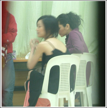 随后周迅的助理走出了休息室,门没有关上,记者从门缝里看进去,穿着黑色露背装的周迅正坐在穿紫色大衣的瞿颖身旁,两人都是背对记者,她们俩挨得很近,不时窃窃私语,周迅还拿出手机翻看短信,一边给瞿颖看两人一边发出笑声。