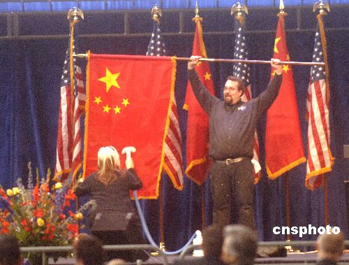 四月十九日,美国西雅图总装波音飞机的“梦工厂”员工正在整理五星红旗,欢迎中国国家主席胡锦涛访问这里。作者:贾国荣