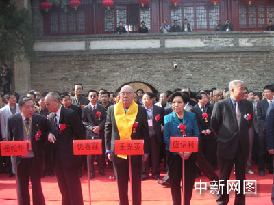 4月20日上午9时20分左右,34响钟声拉开白水县丙戌年谷雨公祭仓颉典礼序幕。 在幽雅的民乐伴奏下,此次公祭活动主祭人——全国工商联名誉主席、原全国人大副委员长王光英缓缓前行,率先向文祖仓颉献上一个素雅的花篮。