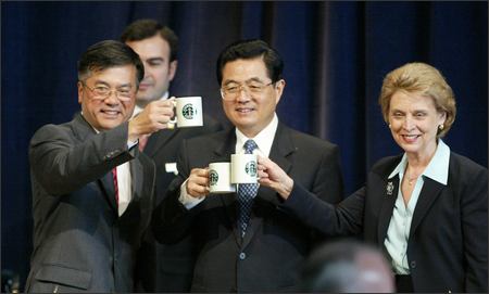 图:胡锦涛和前华盛顿州长骆家辉喝星巴克咖啡