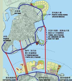 据悉,澳氹海隧座落于旧澳氹大桥附近,海隧两边的上岸点不会在现时的澳氹大桥两边的回旋处,在氹仔一边稍稍北移,座落于将来新填的填海区;在澳门半岛一边的上岸点则下移到新口岸孙逸仙大马路,以免海隧与大桥两边的车流挤压在同一区。