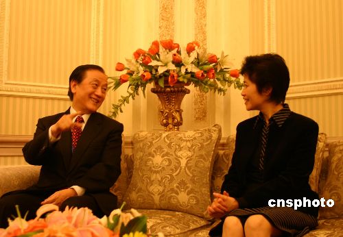 四月二十日,新党主席郁慕明在重庆出席第七届中国重庆高新技术交易会暨第三届中国国际军民两用技术博览会开幕式。图为中共重庆市委副书记邢元敏(右)会见郁慕明(左)。作者:郭晋嘉