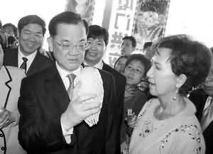 20日上午9点15分左右,连战一行访问厦门台湾水果销售集散中心,并欣然题字。上午8点半,很多果商和群众已经蜂拥而至,争睹连战风采。在第一个摊位,连战饶有兴趣地拿起了一个台南木瓜仔细看了看,因为他就是台南人。