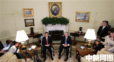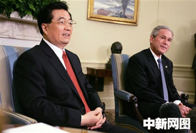 当地时间20日上午,中国国家主席胡锦涛和美国总统布什在小范围会谈之后共同会见记者。