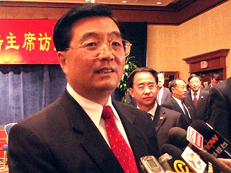 胡锦涛对香港记者说:“我很高兴和香港的传媒朋友们见面,这一次香港传媒对我访美特别重视,派了这么多精兵强将采访报道,我想借这次机会感谢大家所付出的辛劳,也感谢大家对我们这次访问所作的贡献。我想借这次机会请你们转达我对香港同胞的问候,谢谢。”