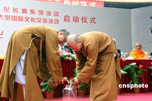 “重走唐僧西行路”大型国际文化交流活动四月二十一日在广州光孝寺启动,来自江西佛学院的明贤法师(右)和来自台湾佛光山的慧宽法师(左)作为本次活动的西行僧人,把分别采自黄河壶口瀑布的水、取自黄帝陵的土和采自日月潭的水、取自阿里山的土汇集在一起,表达了海峡两岸水土交融携手合作的美好愿望。作者:邢健