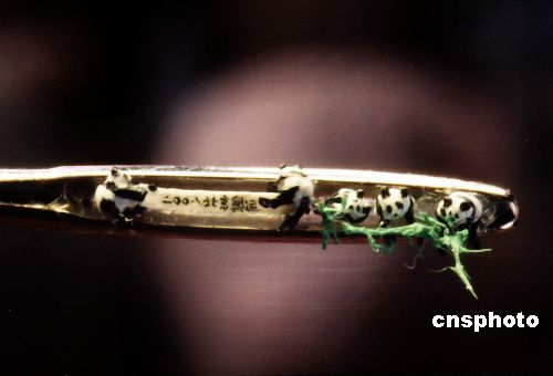 中国台湾著名微雕艺术家陈逢显四月二十日携最新作品《针孔中的大熊猫世界》来沪作首度展出。在这件作品中,小小的针孔中“居住”了五只活灵活现的大熊猫,有的大熊猫在吃竹子,有的正在把玩刻有“二○○八北京奥运会”字样的横幅,生趣盎然。作者:南星