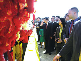 令人惊喜的是,胡主席在与侨领们握手后,走向瑞狮和麒麟的队伍,向表演者挥手,并同大家握手,连说“谢谢”。记者拍照时,胡主席也伸手过来与记者一握,充分展现了他亲民的作风。
