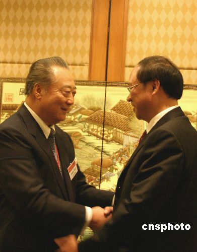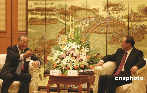 四月二十三日,国台办副主任郑立中在重庆会见台湾工商界川渝经贸考察团一行,与团长辜濂松先生(左)亲切交谈。台湾工商界川渝经贸考察团由台湾中国信托金融控股公司董事长辜濂松任团长、中国国民党副主席江丙坤任顾问,将在重庆进行为期三天的参访。作者:郭晋嘉