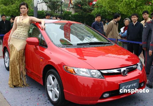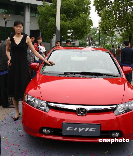 4月22日,一位车模在南京市民广场展示全新CIVIC。东风本田推出的全新CIVIC在全国特约销售店进行同步上市。据了解,作为2006年国内汽车市场备受关注的中级车售价为14.78万元-18.88万元。全新CIVIC融入了Honda全部技术精华,获得世界安全性能评价NCAP的最高水准——“五星级”安全标准,率先达到具有世界严格标准的欧洲Ⅳ号废气排放标准。 作者:阿董