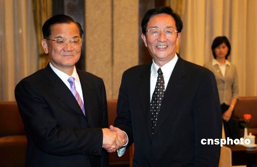 四月二十四日晚,中共中央政治局委员、上海市委书记陈良宇(右)在上海会见中国国民党荣誉主席连战(左)一行。作者:汤彦俊