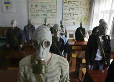 中新网4月24日电 据路透社报道,4月26日是切尔诺贝利核泄漏事故20周年纪念日,乌克兰和白俄罗斯都将举行各种形式的纪念活动,以此悼念在那次严重事故中遇难的人们。图为切尔诺贝利核电站附近学校的孩子们在核安全演习课上带着防毒面具。(春风)