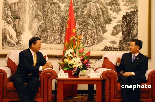 四月二十五日,中共重庆市委书记汪洋会见在渝参观访问的中国国民党副主席江丙坤夫妇。由台湾中国信托金融控股公司董事长辜濂松任团长、中国国民党副主席江丙坤任顾问的台湾工商界川渝经贸考察团,于二十三日抵渝开始为期八天的川渝之旅。图为汪洋(右)与江丙坤亲切交谈。作者:郭晋嘉