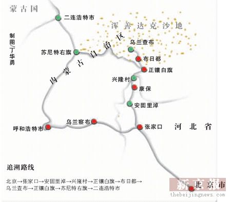 从“兴隆村”沿105省道往东北方向行驶50公里,是浑善达克沙地南部边缘的正镶白旗。穿过正镶白旗的县城,顶着风沙继续向西北前行,便正式进入了“浑善达克”沙地,风沙的强度明显增大。沙土和碎石铺成的公路两侧,是无边的荒漠,属于禁牧区的荒地上,偶有羊群和奶牛散放。