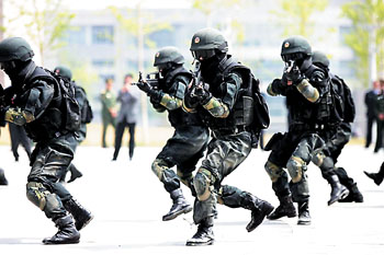 中新网4月28日电 昨天,北京奥运安保实战培训宣布启动。启动仪式后,首次公开亮相的武警特战大队“雪狼突击队”和北京特警进行了实战科目的演练。