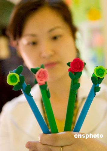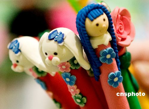 4月27日,在安徽省淮北某饰物店里,一女孩在挑选陶泥笔。这种用绿色环保的陶泥制作的笔造型可爱、颜色鲜艳,即可写字又能把玩欣赏,深受年轻们喜爱。作者:王璋闻