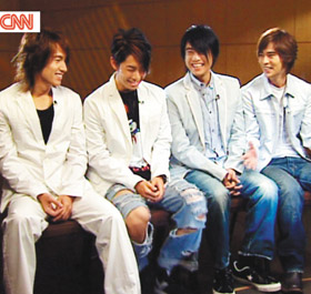 中新网4月28日电 偶像团体F4在香港成功完成演唱会后,日前接受美国有线电视新闻网CNN的“亚洲名人聊天室”节目专访,访谈中4人畅谈想打入美国市场的梦想及成名后的代价。台湾媒体报道,这次访问是由在亚洲地区享有超高人气的主持人韩玉花(Lorraine Hahn)全程以英语专访的,在半小时的访谈中,F4侃侃而谈许多工作上的趣事。自小在美国长大的吴建豪和在新加坡受英文教育的朱孝天都用英文回答,仔仔周渝民与暴龙言承旭则透过节目中的翻译,以中文表达自己的看法。