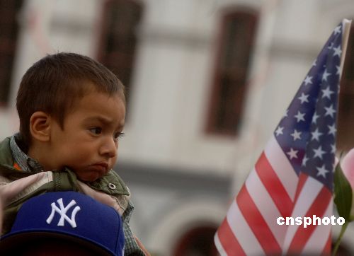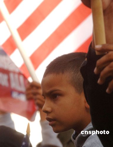 美国洛杉矶一位拉丁裔孩童在爸爸身上盯着星条旗,美国有议员提修正案,取消美国出身的非法移民子女自动成为美国公民一款,修正案如获通过,将造成二百万混合家庭破散。为此,继大规模反移民法游行后,一场大罢工将在五月一日国际劳动节举行。作者:贾国荣