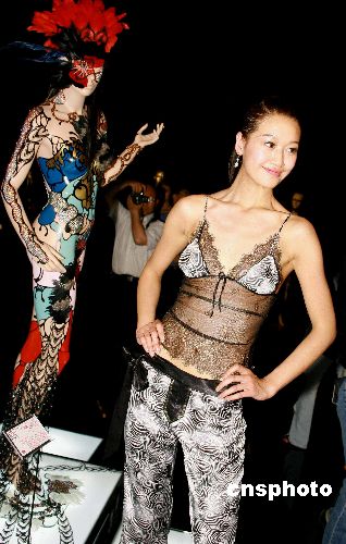 珍珠衫、水晶衣、钻石文胸、白金内衣……在光导纤维克隆的美丽天幕下,一件件令人目眩的内衣梦一般出现在人们面前,“爱慕·美丽中国行”于4月29日至5月3日来到西安世纪金花钟楼购物中心广场。图为模特展示一套白金钻石内衣。作者:劳达