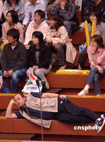 4月29日,日本仙台,2006汤尤杯羽毛球比赛进入第二天赛事,一名观众悠闲地侧卧在看台上观看比赛。作者:张宇