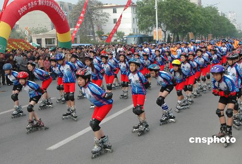 5月4日上午,山东省聊城市180名轮滑爱好者齐聚一堂,在市区主干道东昌大街6公里路段内表演“刷街”,壮观的场面吸引了节日中众多市民和游人观看。作者:张振祥