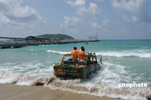 图为水陆两栖车载着游客驶进海面。