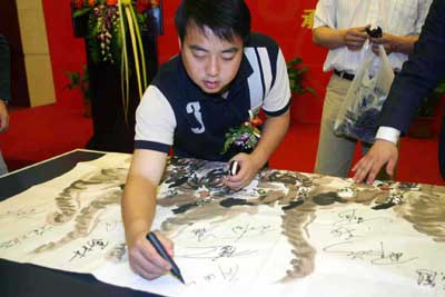 在昨天的庆功会上,以画虎著称的国画画家、中国青年画院常务院长林剑冲先生现场为王楠、张怡宁、王励勤等十名运动员及主教练挥毫泼墨,献上了自己所作的“啸虎图”,还为国家乒乓球队献上精心创作的“群虎图”,运动员还在“为2008奥运会助威”的巨幅群虎图上庄严地签下了自己的名字。