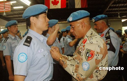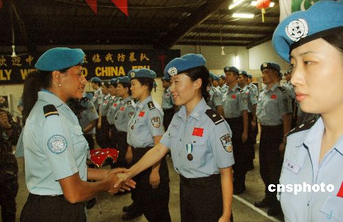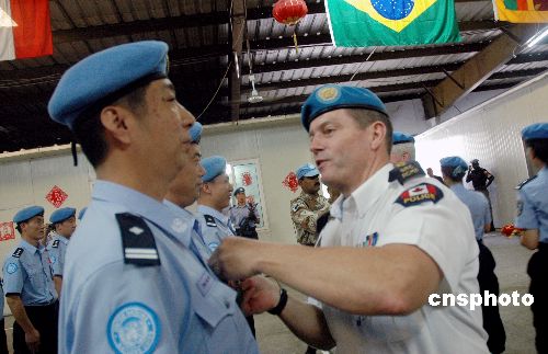 5月4日海地太子港消息:5月4日,中国第三支驻海地维和警察防暴队迎来了激动人心的时刻,今天他们在海地太子港营区接受联合国授予的“联合国和平勋章”,警察总监缪尔、副警察总监多米尼克,各国驻维和部队司令、维和防暴队队长等为中国第三支驻海地维和警察防暴队队员授勋,中国第三支驻海地维和警察防暴队125名队员全部来自山东省各级公安机关。作者:陈进