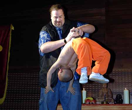 演出结束后,由演出公司招待奥地利各界人士与少林寺武僧们见面和交流,演出公司总经理Fechter先生向与会着介绍了少林武术的历史和沿革,并请小武僧向大家表演了气功功夫。维也纳22区四川饭店为酒会准备了可口的饭菜,给这次活动增色不少,大家频频举杯祝少林武术表演团在奥地利演出成功,祝禅宗智慧为代表的武林功夫在奥地利生根开花。(佐勇 摄影报道)